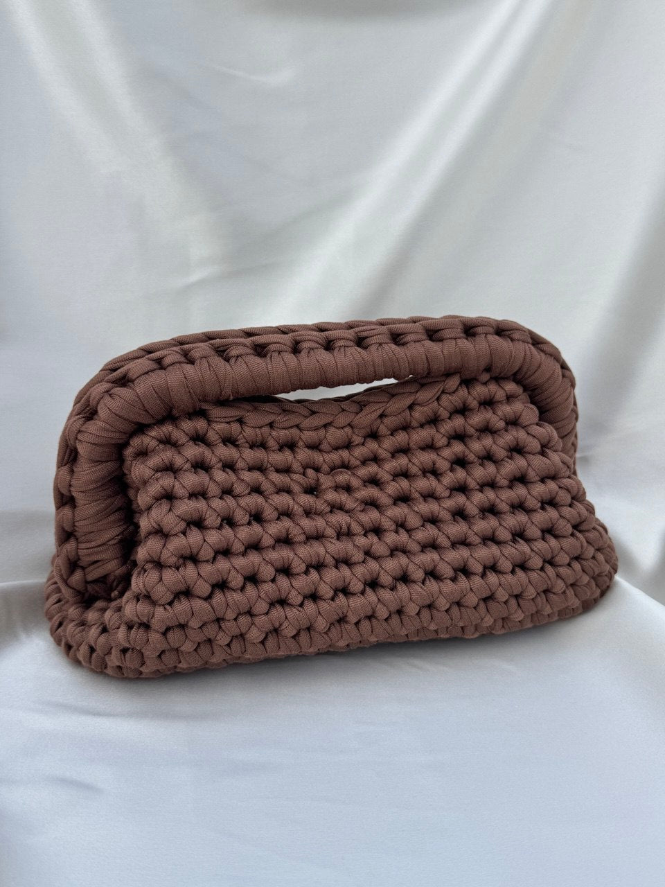 Clutch con manico realizzata interamente a mano con filato di lycra.
