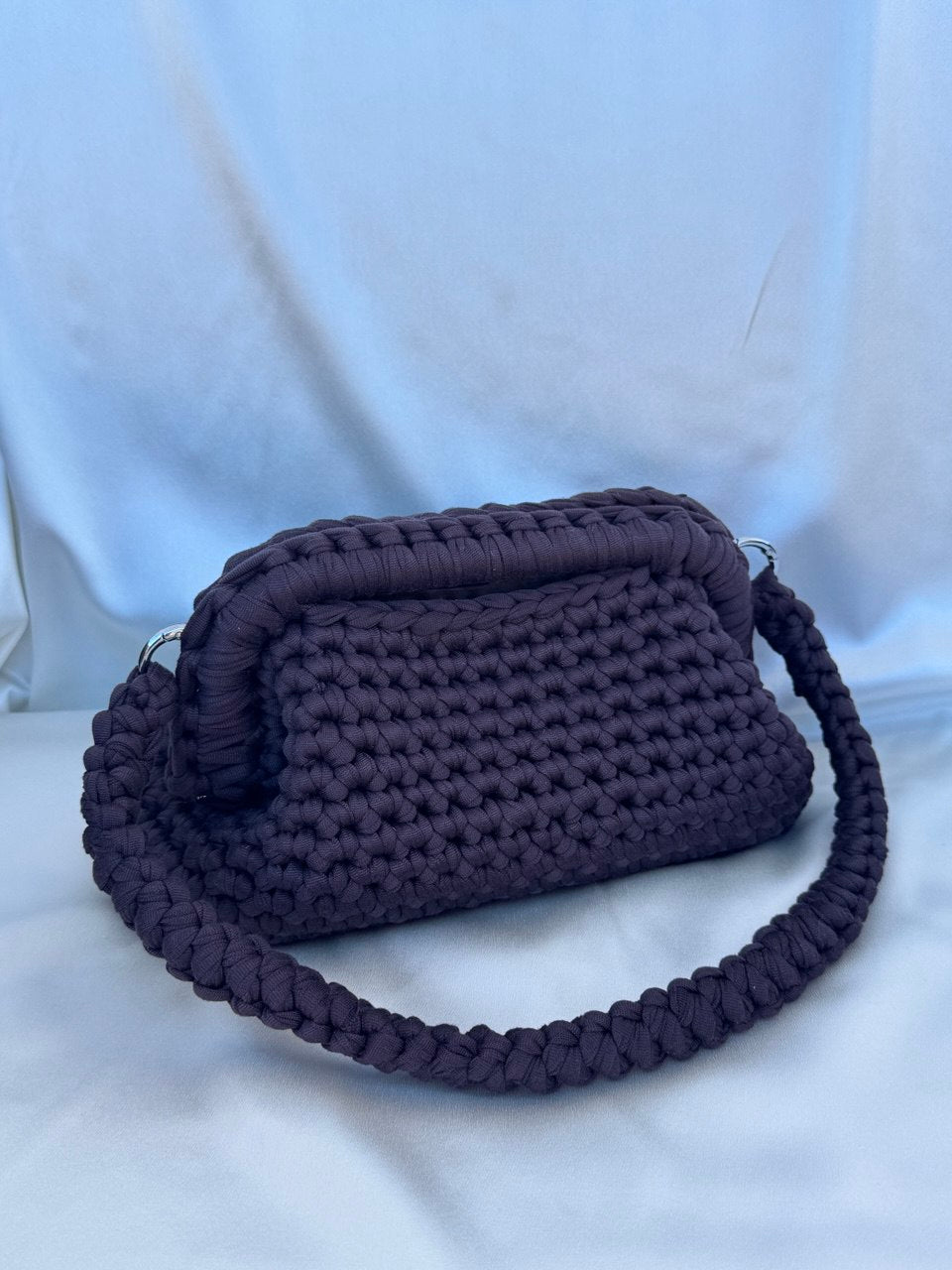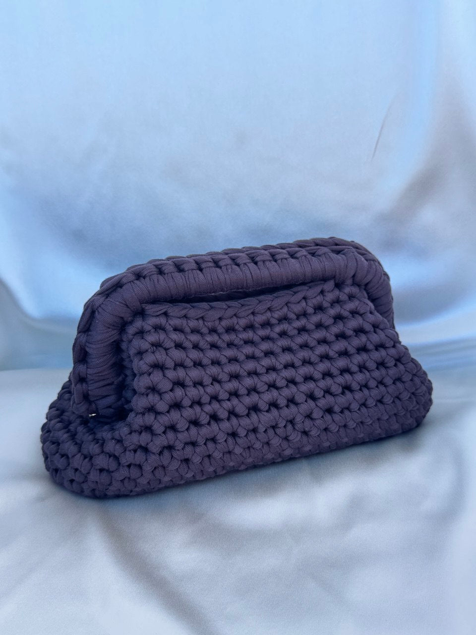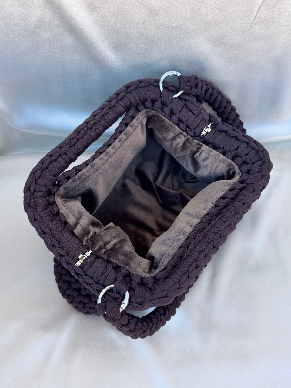 Clutch con manico realizzata interamente a mano con filato in lycra e fodera interna marrone vellutata.