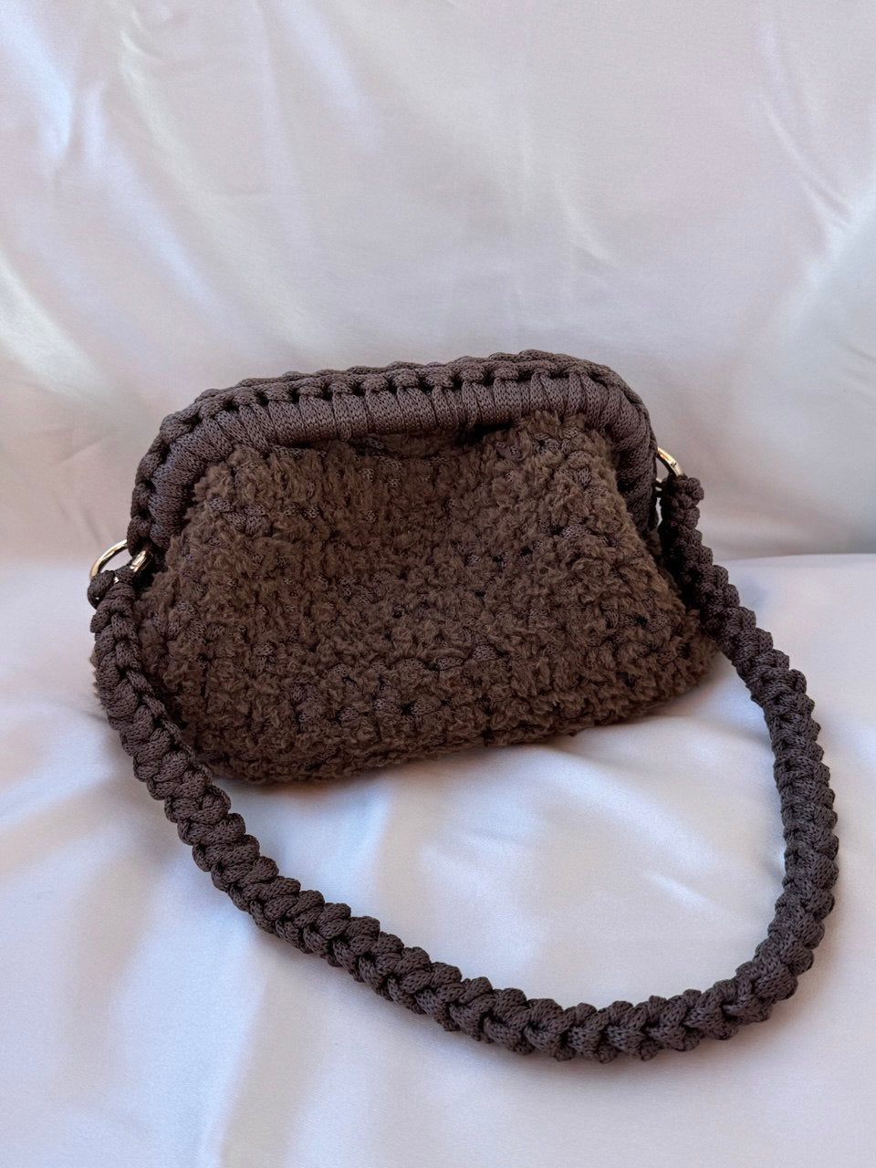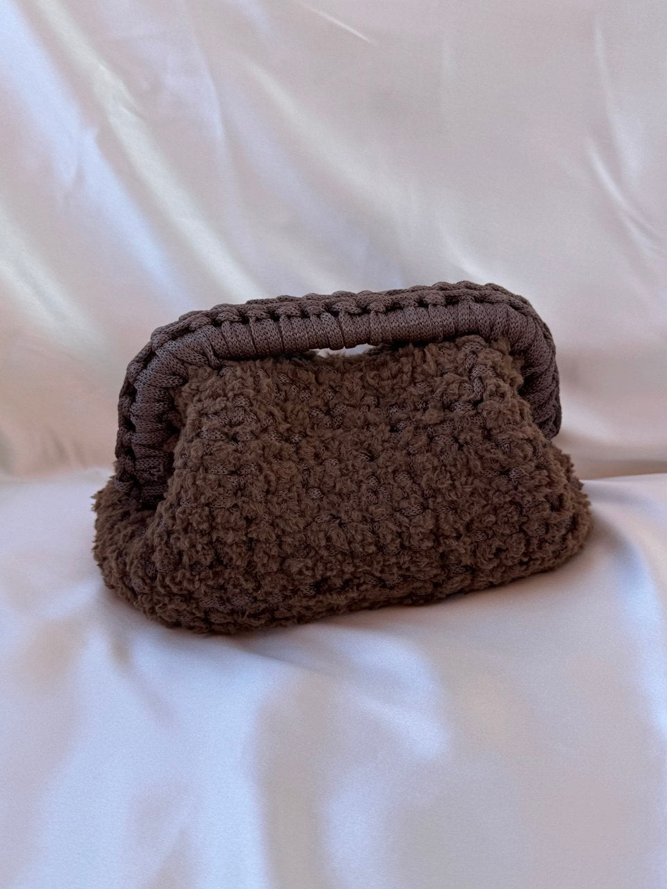 Clutch con manico realizzata interamente a mano con cordino e filato teddy.
