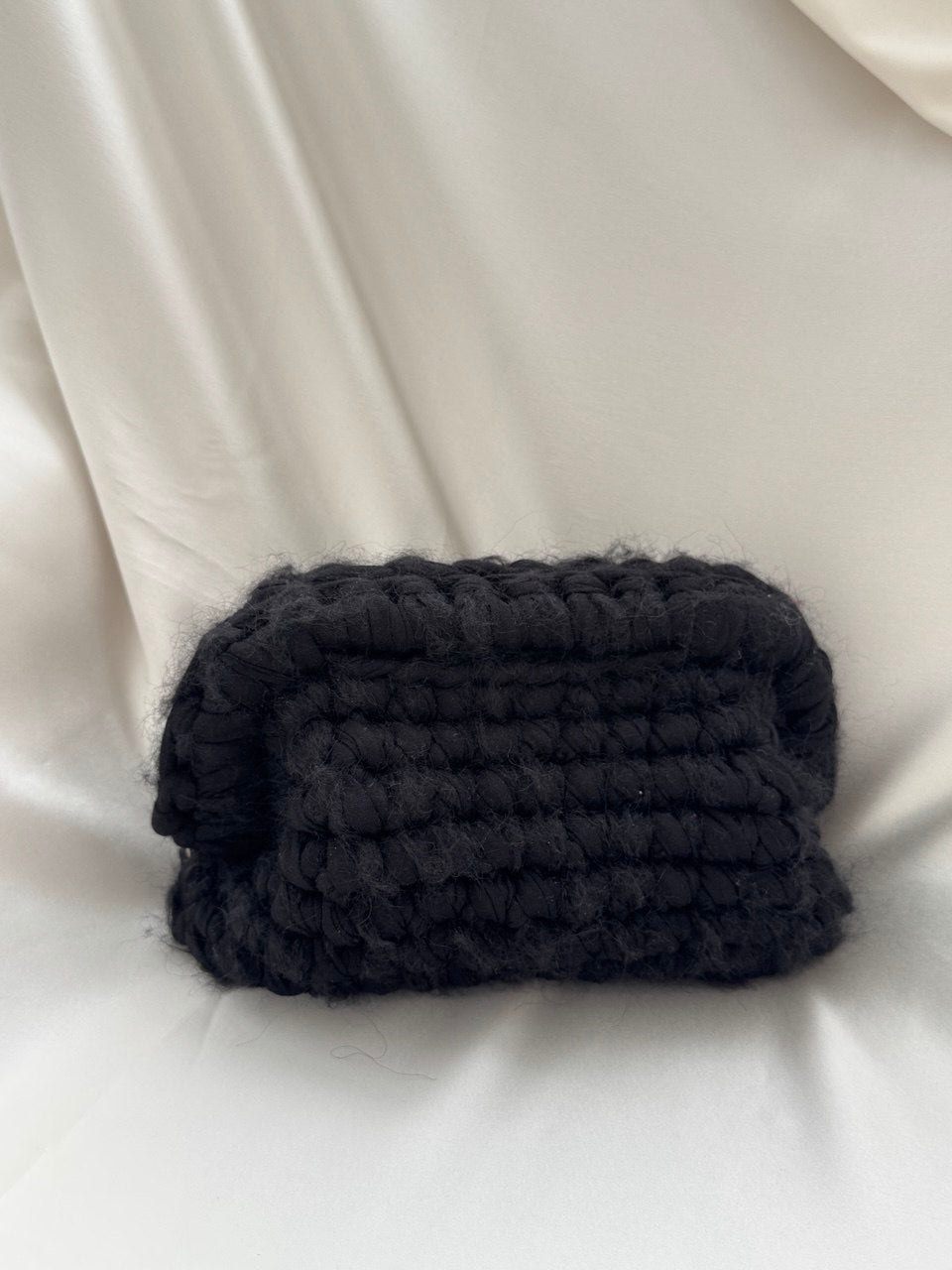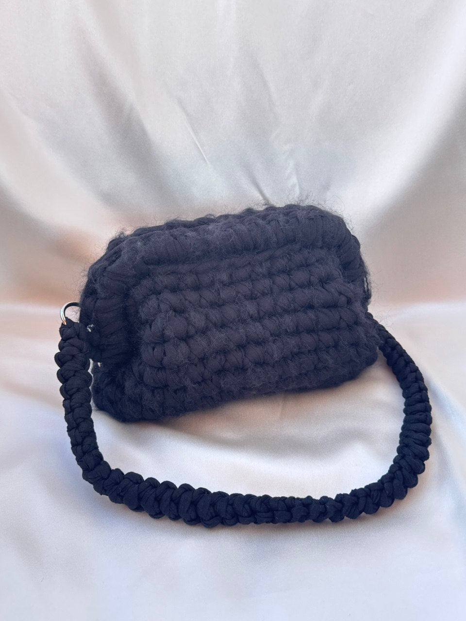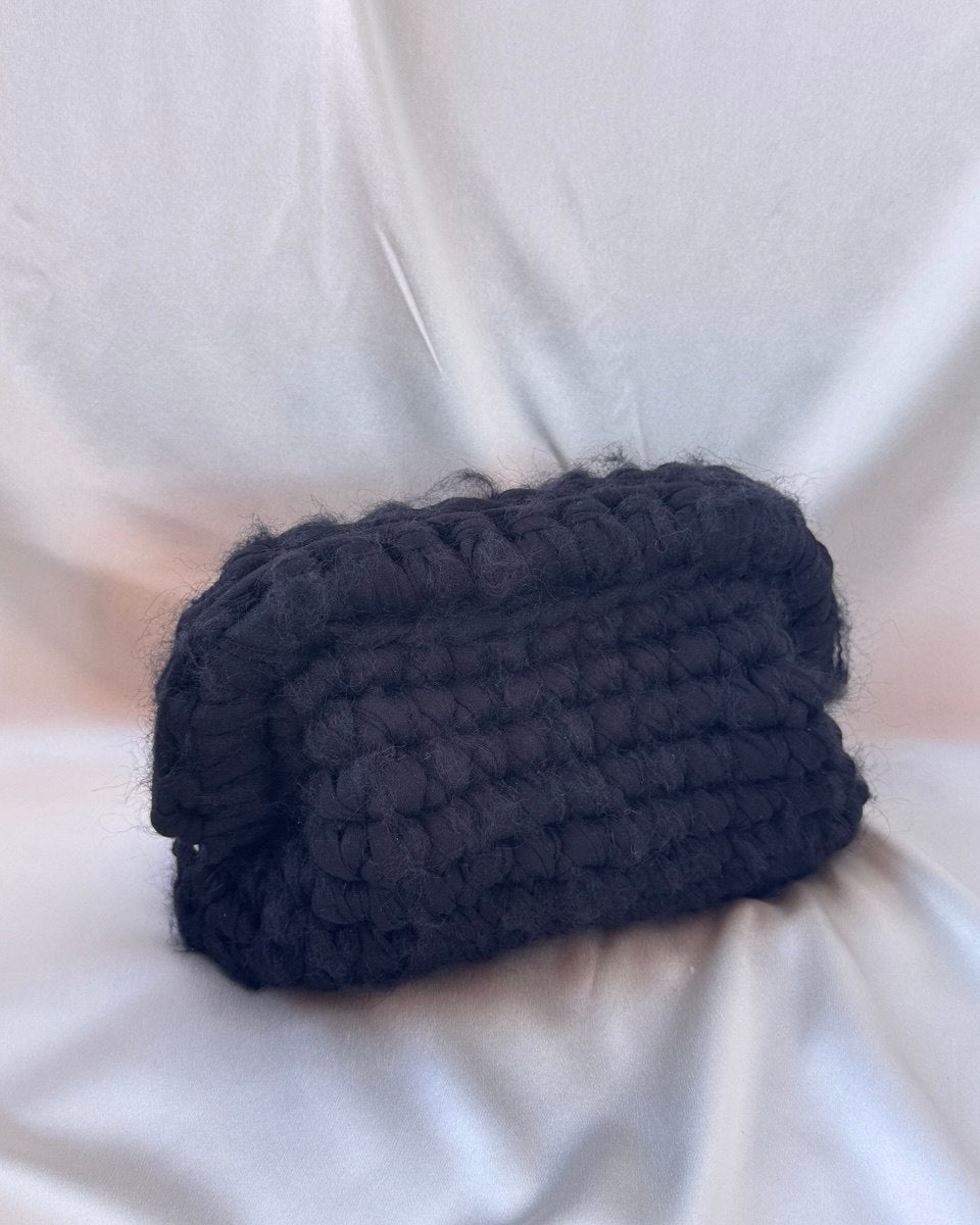 Clutch con manico realizzata interamente a mano con filato di cotone e filato di lana.