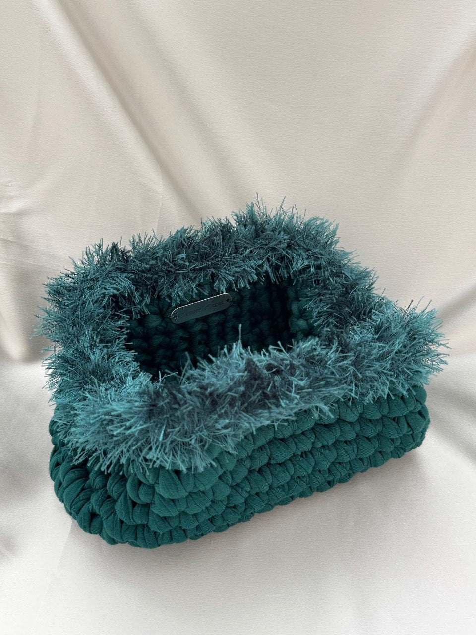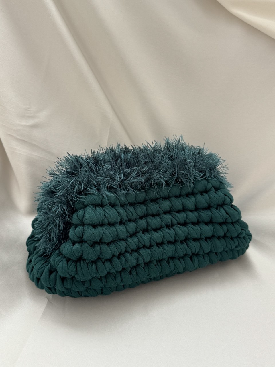 Clutch con manico realizzata interamente a mano con filato di cotone, arricchita da dettagli con filato effetto pelo.