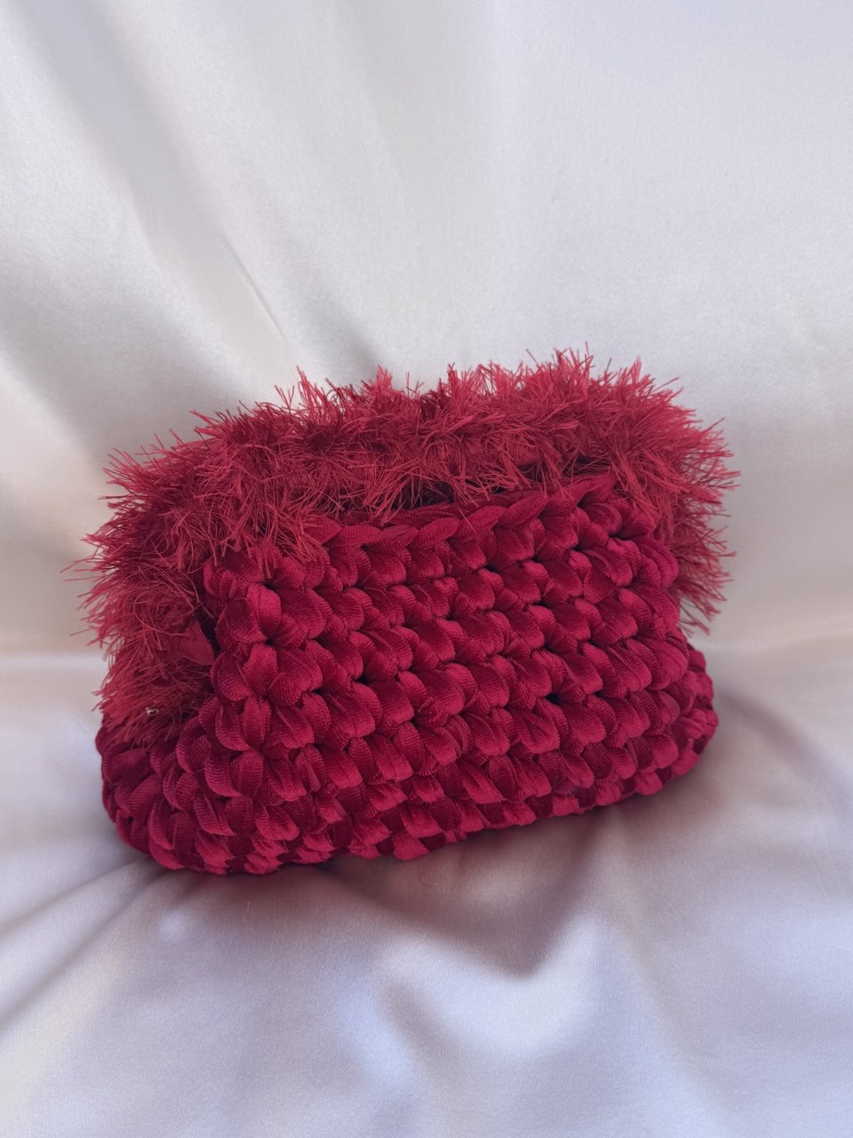 Clutch con manico realizzata interamente a mano con filato di velluto, arricchita da dettagli con filato effetto pelo.