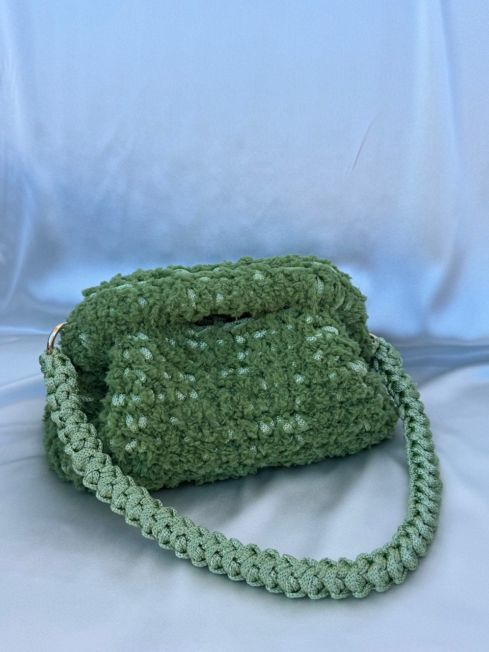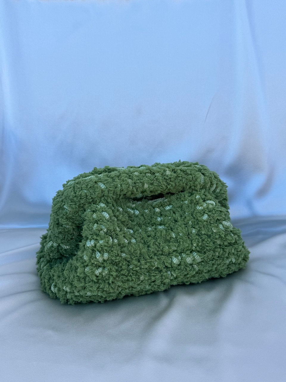 Clutch con manico realizzata interamente a mano con cordino e filato teddy.