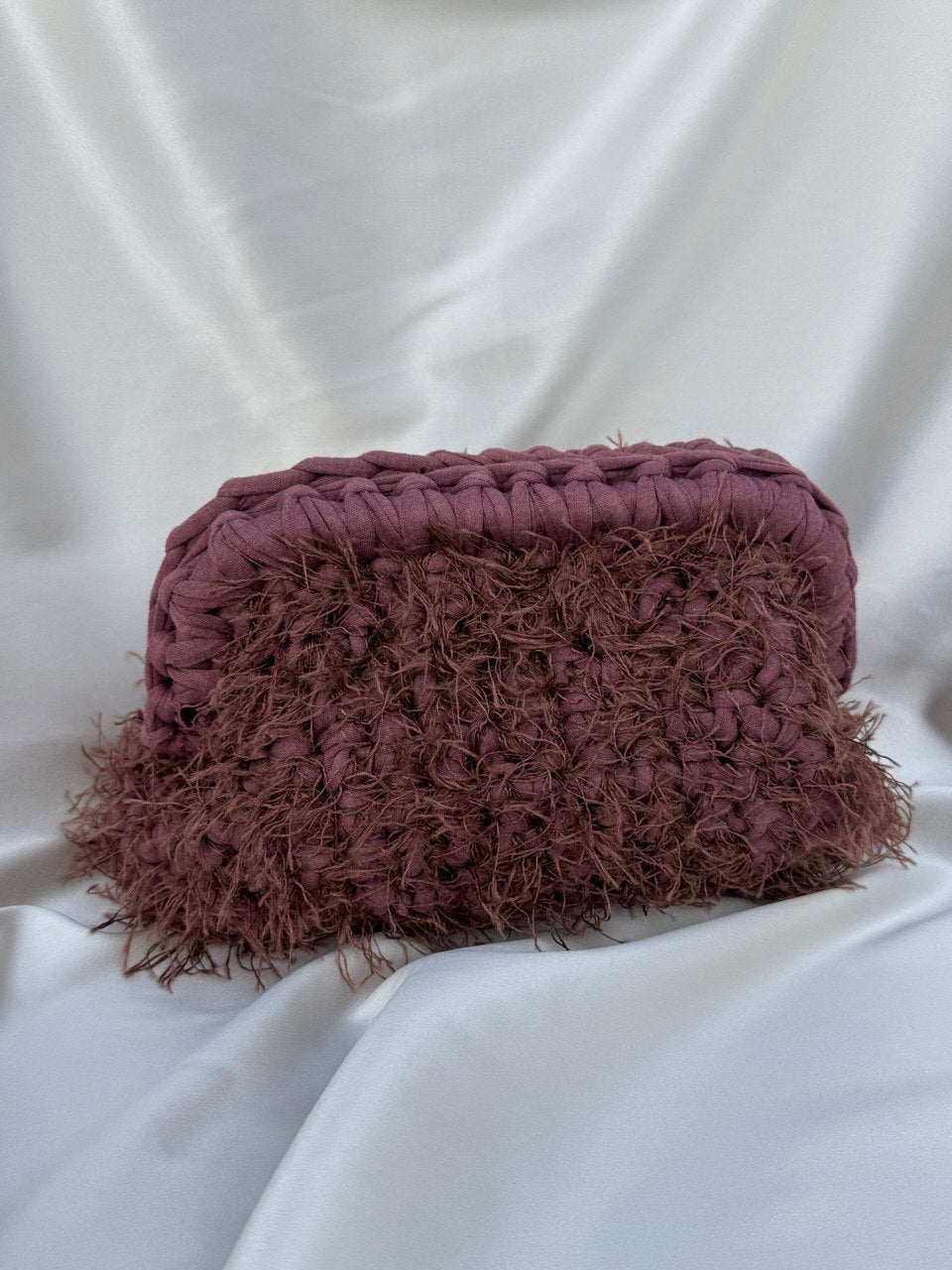 Clutch realizzata interamente a mano con filato di cotone e dettagli con filato effetto pelo.