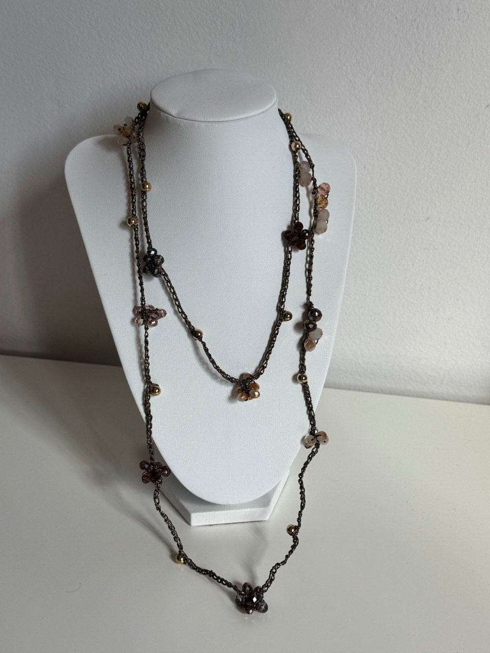 Collana interamente realizzata a mano, lavorata con un raffinato filo antracite che le conferisce eleganza e luminosità. Lungo la catena sono distribuite piccole perline dorate e grappoli di diverso colore.