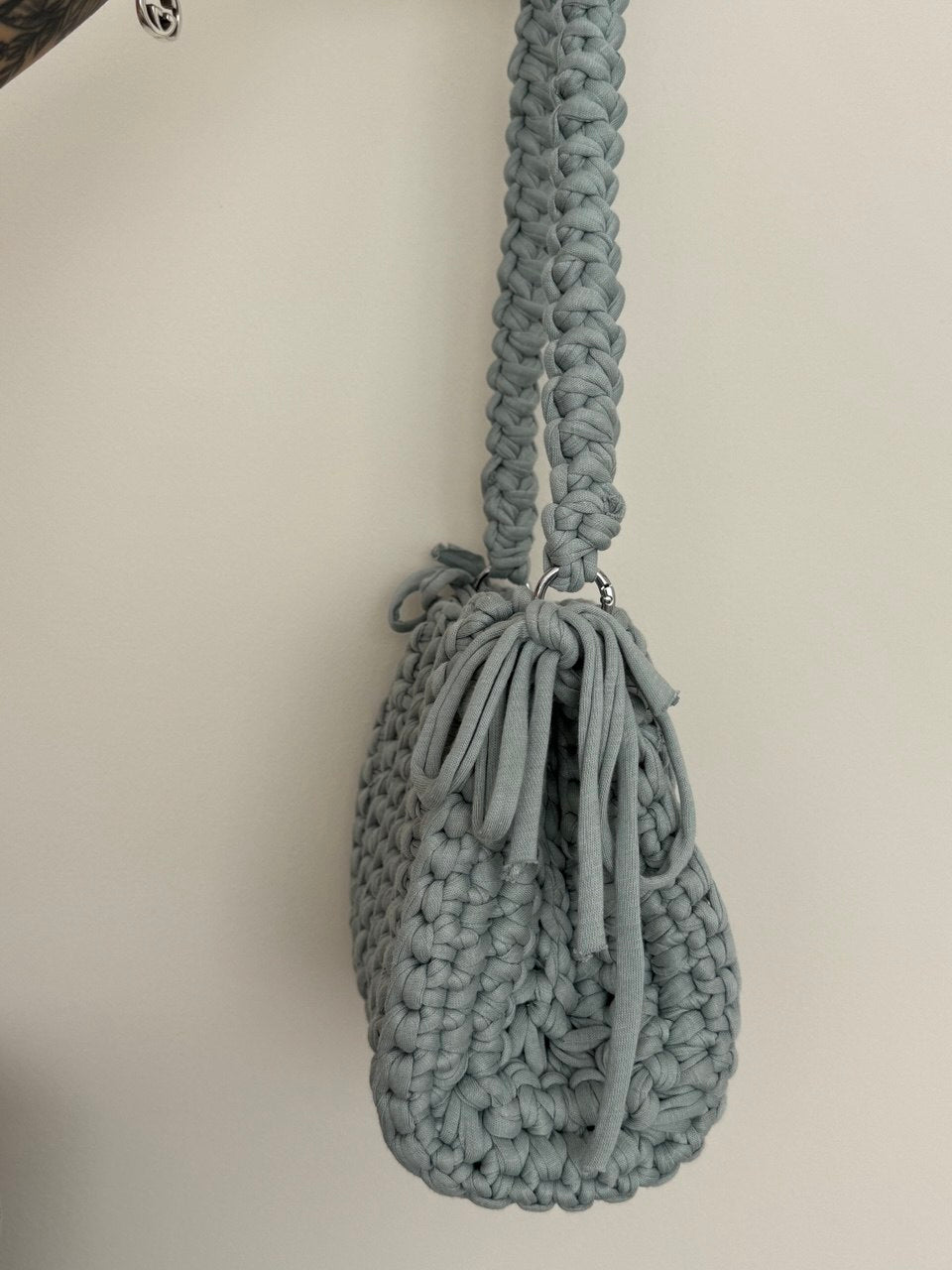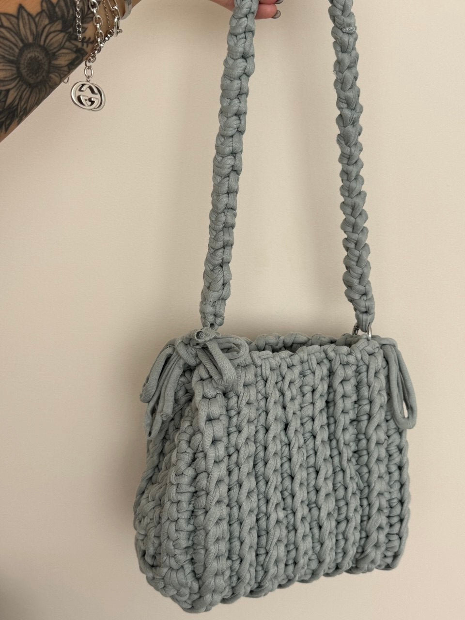 Borsa realizzata interamente a mano con filato di cotone, decorata con fiocchi laterali.