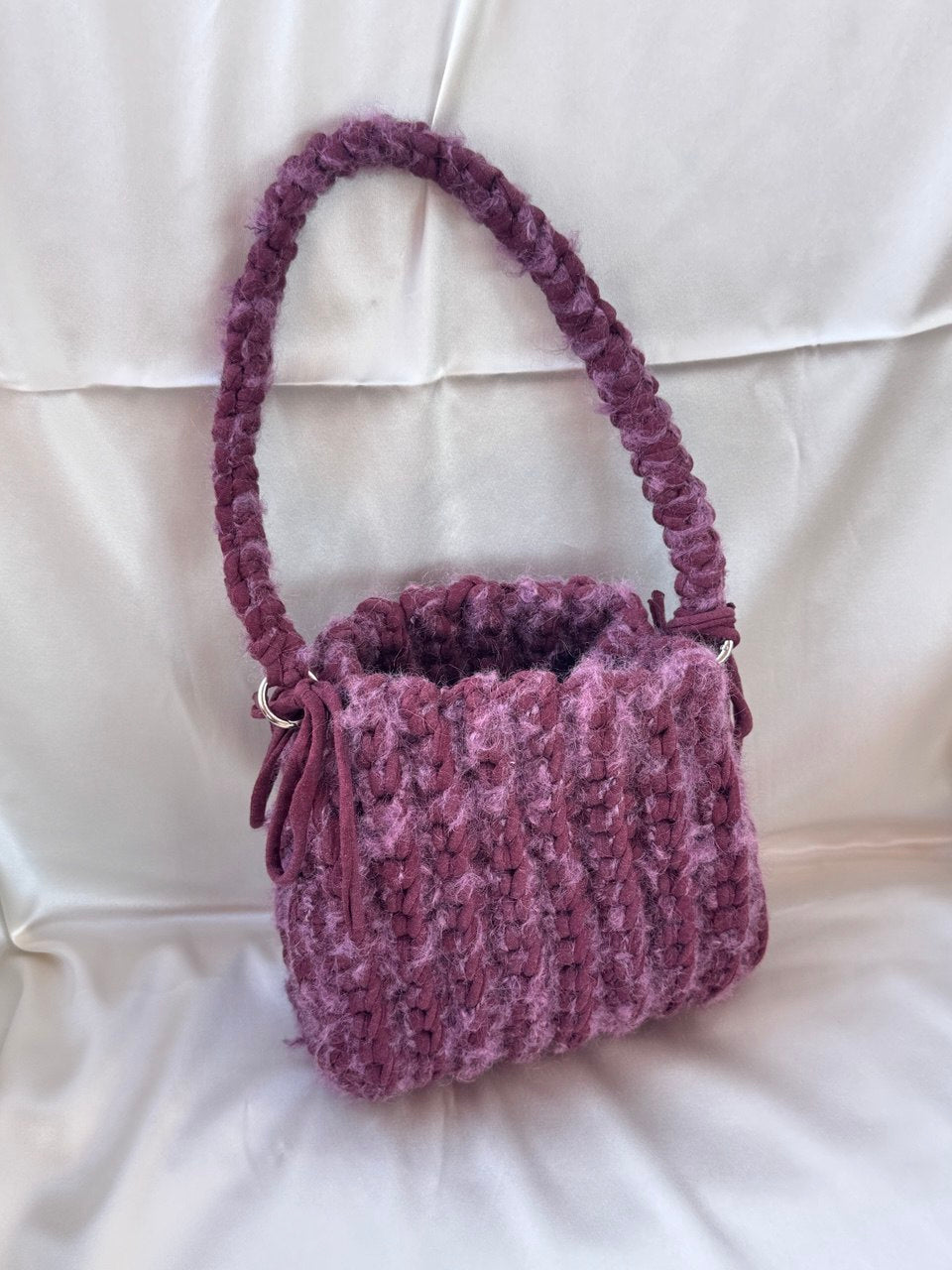 Borsa realizzata interamente a mano con filato di cotone e filato di lana, decorata con fiocchi laterali.
