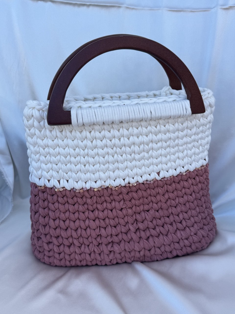 Borsa con manico realizzata interamente a mano con manico in legno e fondo in pelle tono su tono