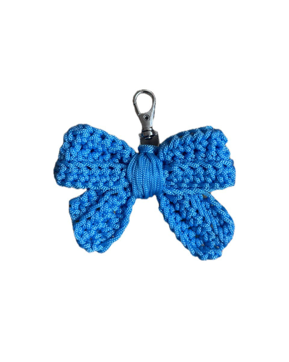 Portachiavi a forma di fiocco, realizzato interamente a mano con cordino celeste