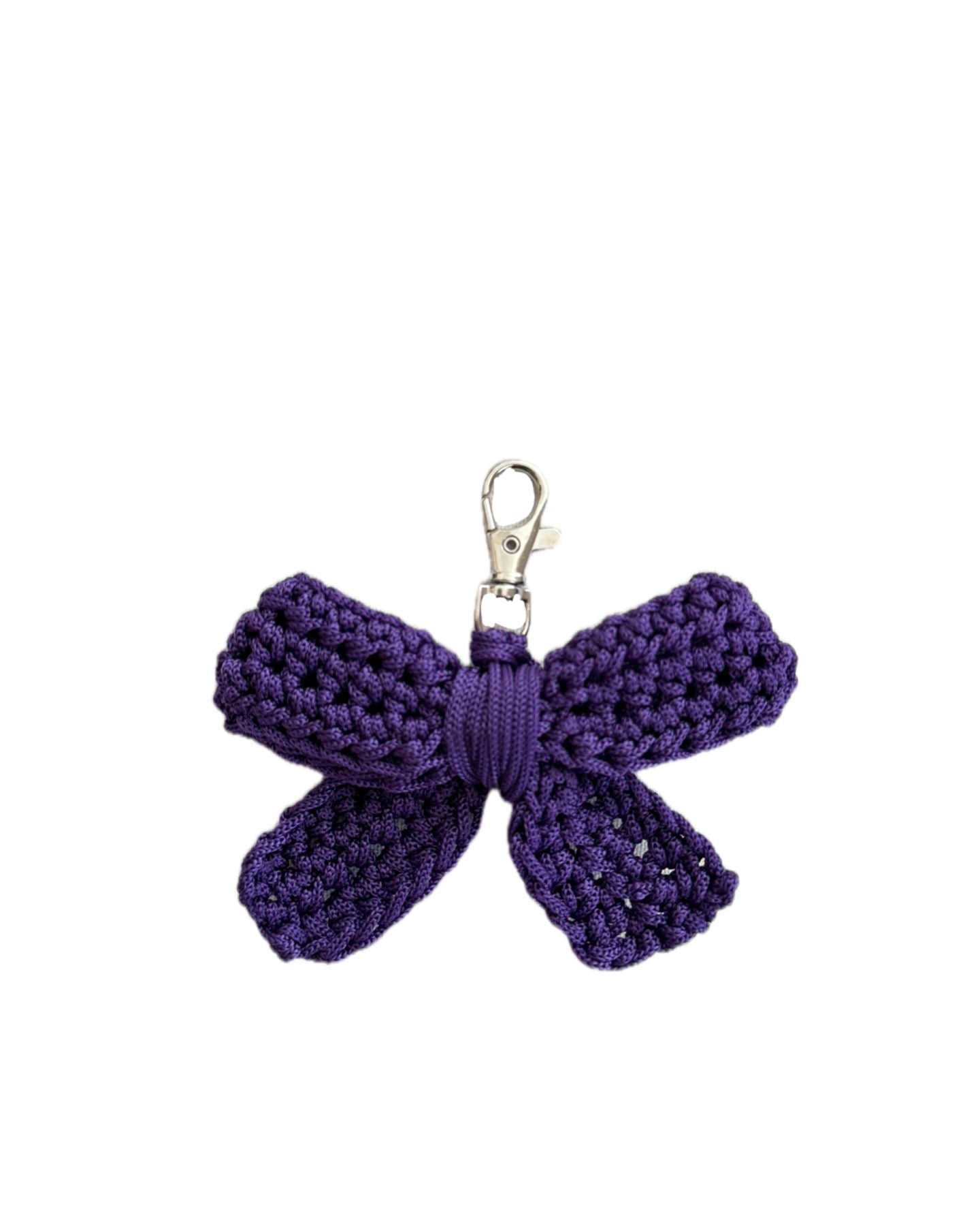 Portachiavi a forma di fiocco, realizzato interamente a mano con cordino viola