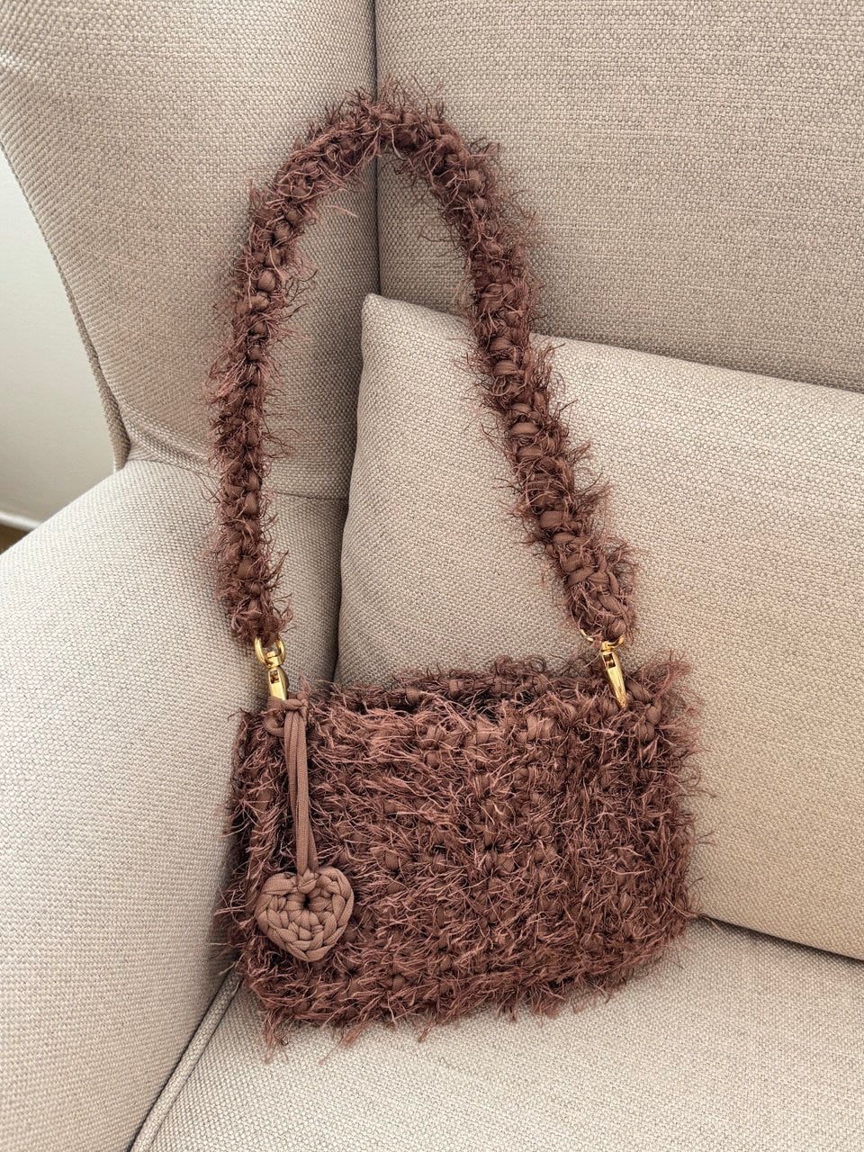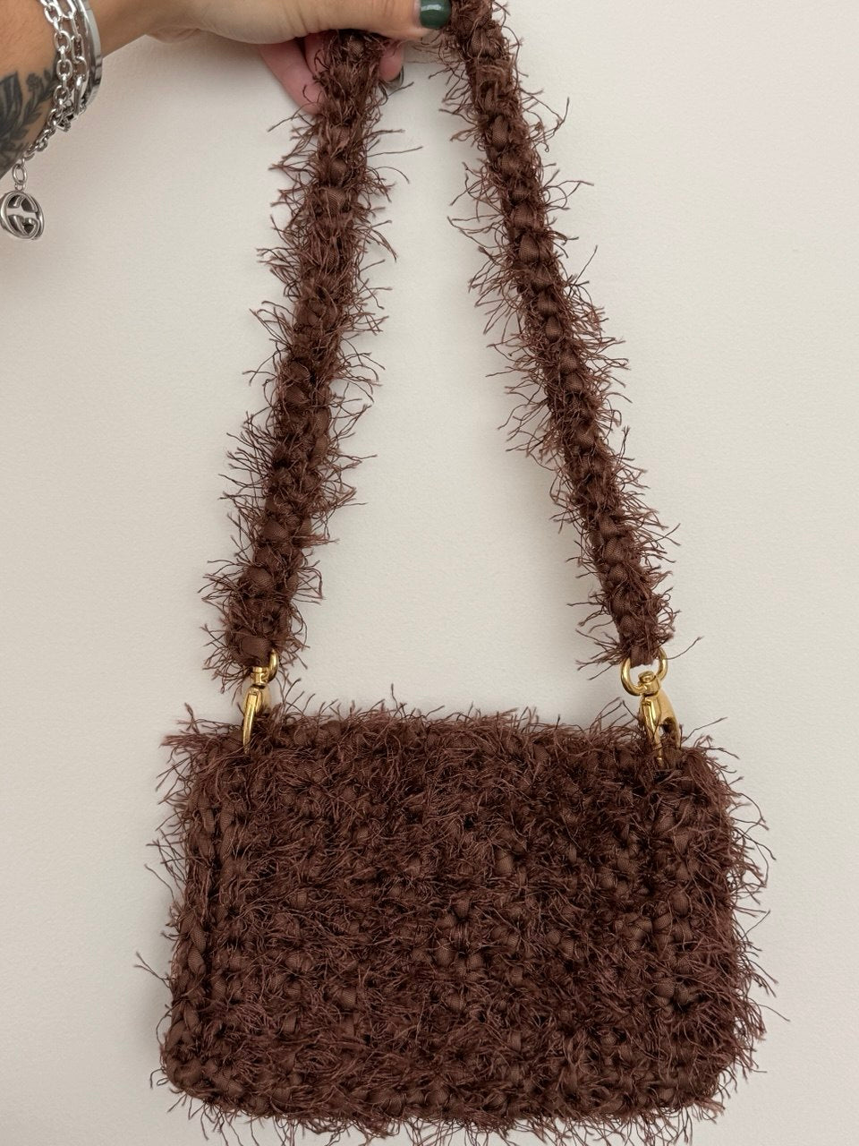 Borsa a spalla realizzata interamente a mano con filato in lycra e filato effetto pelo.