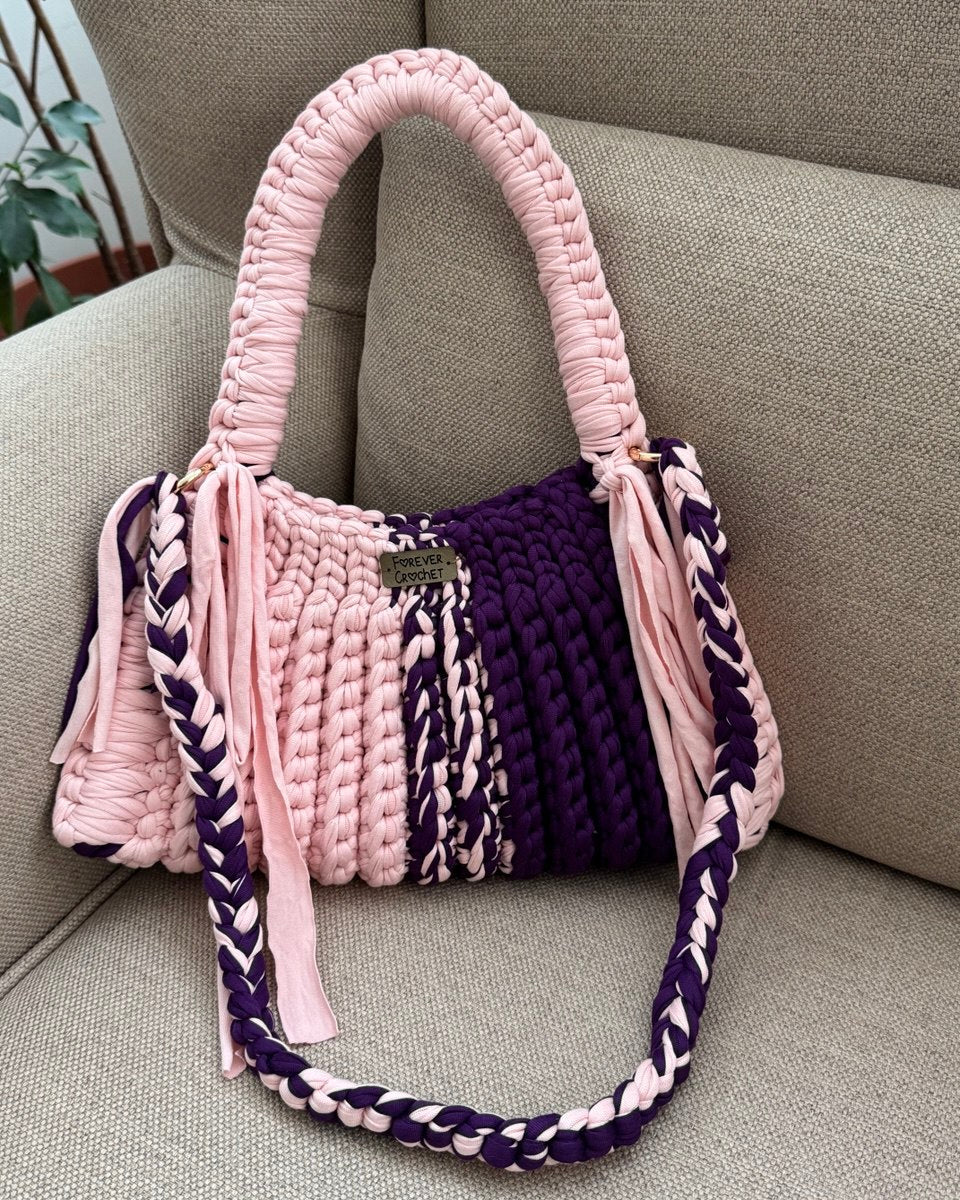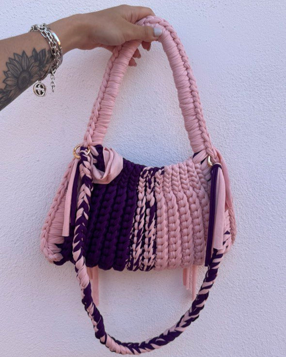 Borsa a spalla realizzata interamente a mano rosa e viola con frange